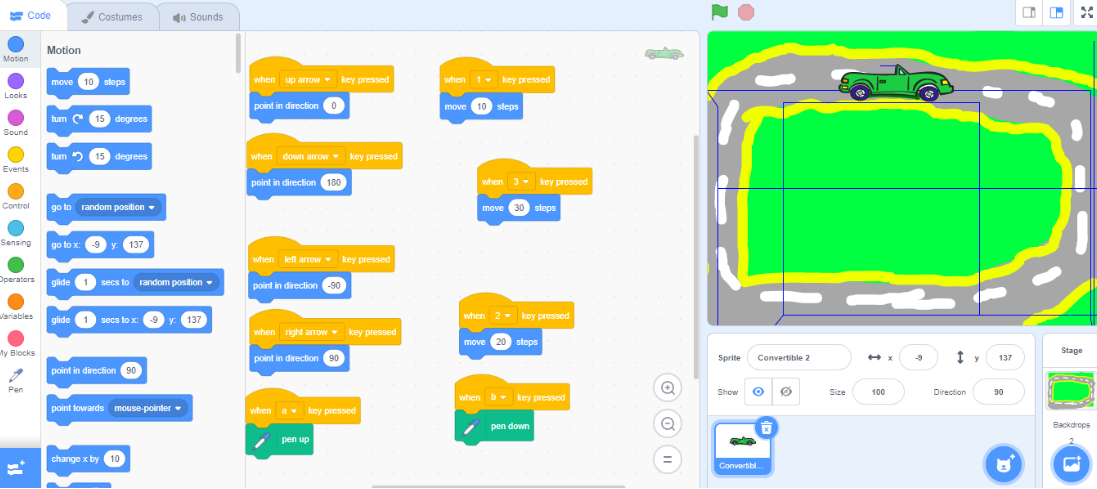 We created our backdrop using the ‘Design a backdrop’ tool. Then we added an extension and programmed the pen to move up and down to draw on the screen. We used the pen/pen down block program to make it look like the car was leaving behind a smoke trail.