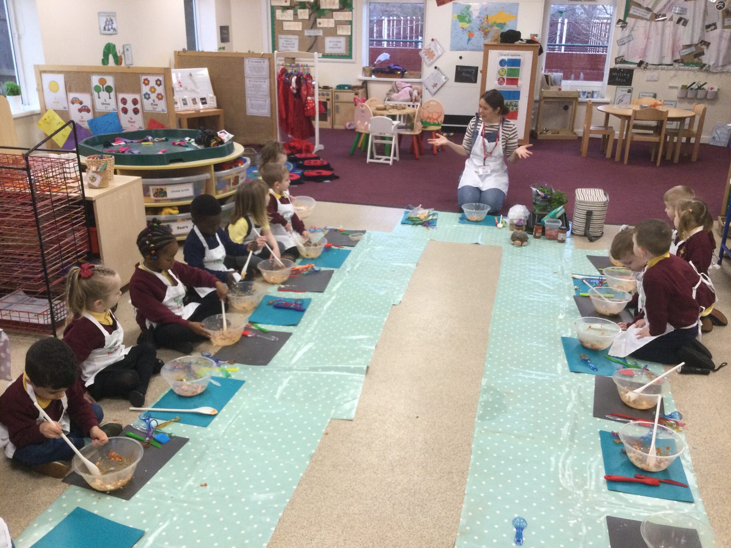 Nursery had a lovely visit from Tiny Tasters this morning. Mrs Taster showed the children how to prepare ‘Little Red Riding Hood’s Red Tomato Puffs’. The children snipped, scooped, mixed, crumbled and cut and tried new ingredients like red pesto and feta cheese. They listened and followed instructions and thoroughly enjoyed their cooking session. The children were delighted to take their baked treats home for lunch, along with a recipe card and a ‘top chef’ sticker.