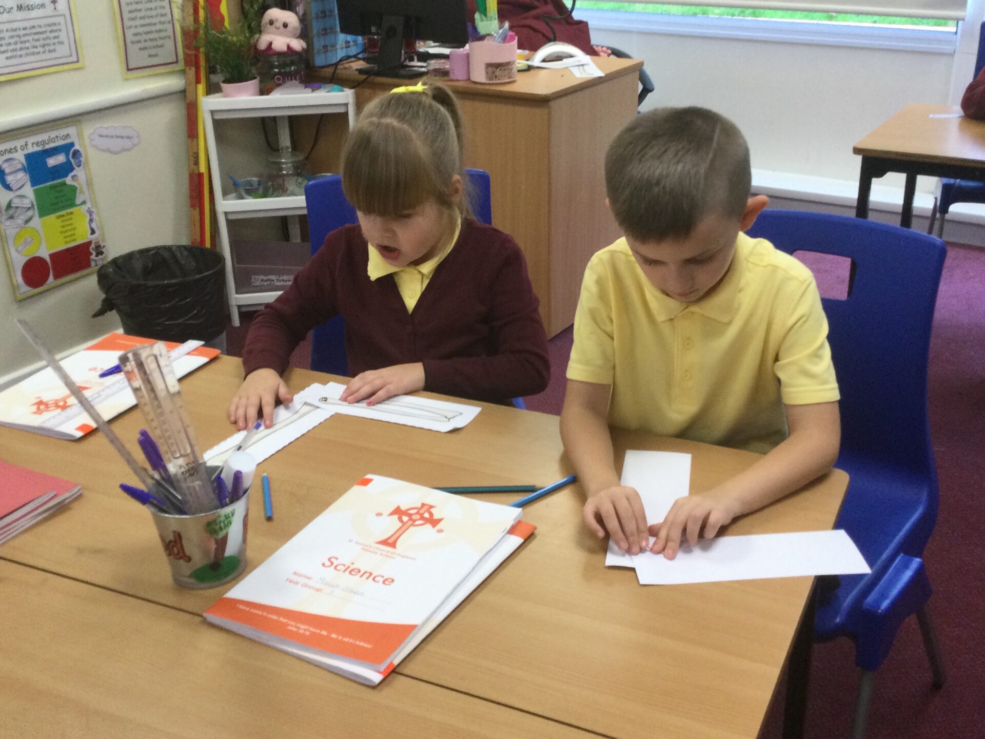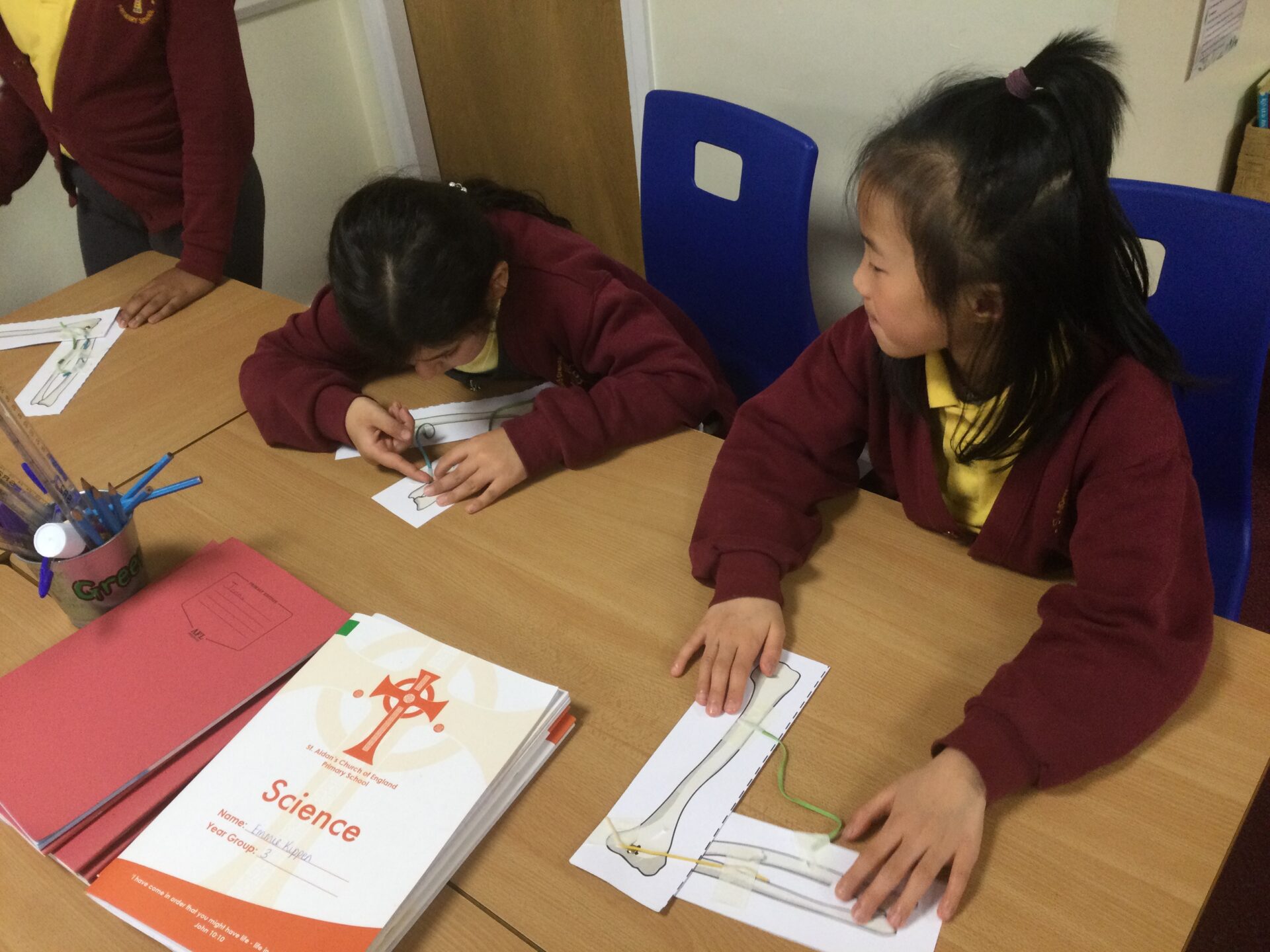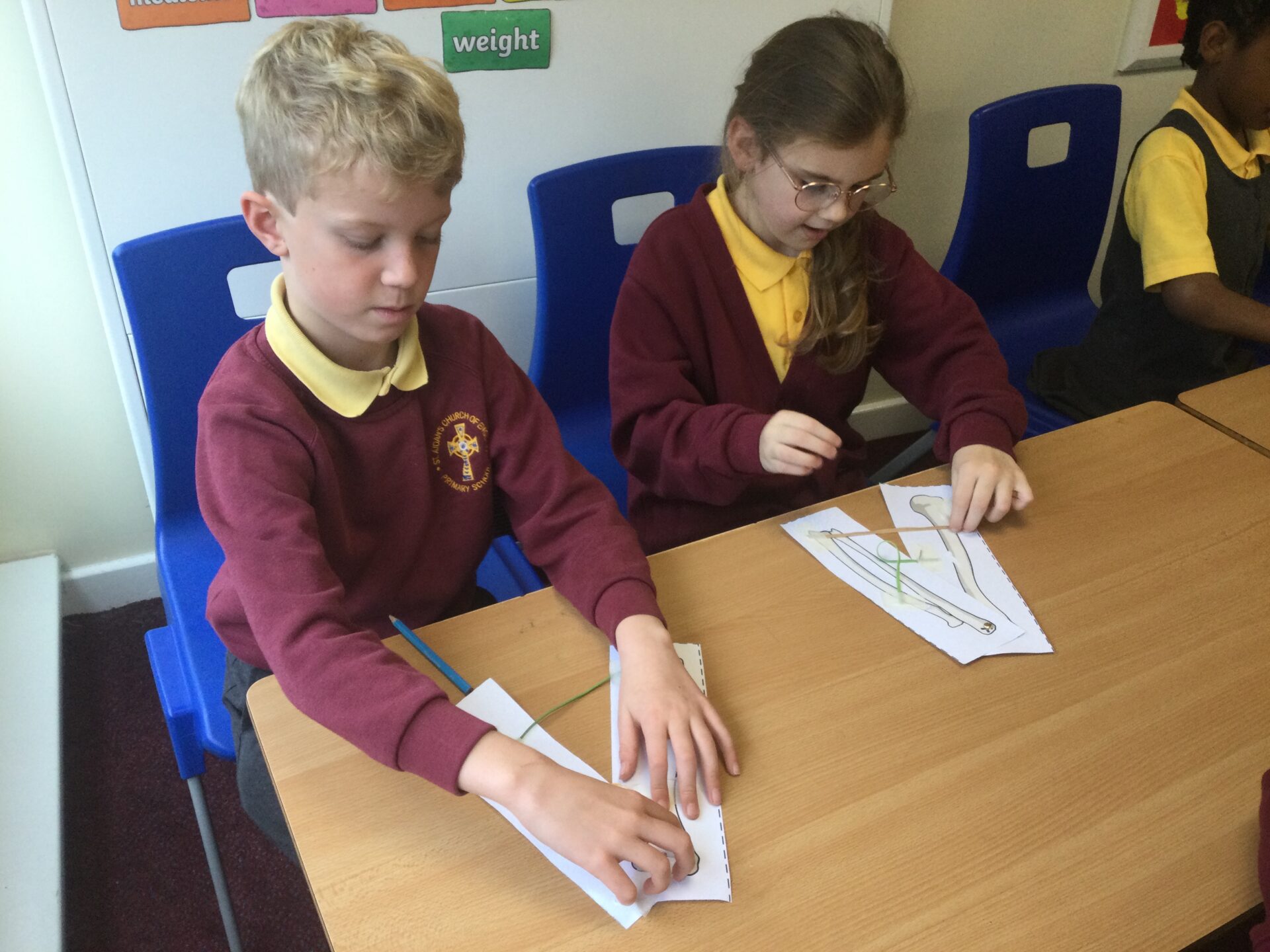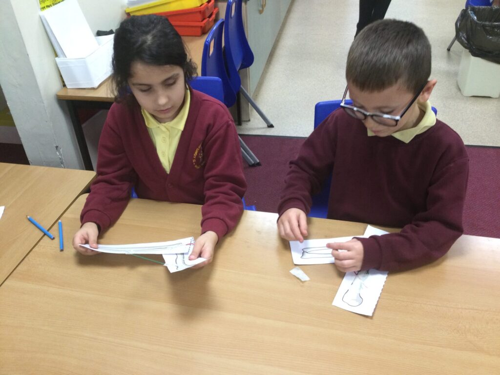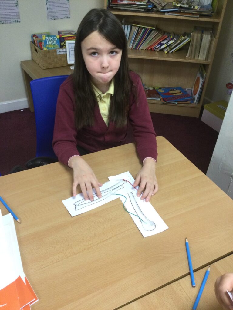 In Science, we have been learning all about Animals including Humans. We have learnt all about different food groups and how to stay healthy which included keeping track of a food diary to show how much fruits and vegetables we ate over the course of a week. As well as learning all about the insides of our bodies including our skeletons and our muscles. Our topic concluded with a practical activity where the children created a replica arm to show what happens when our biceps and triceps contract and retract.