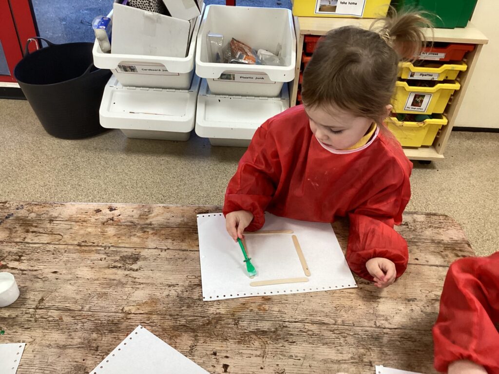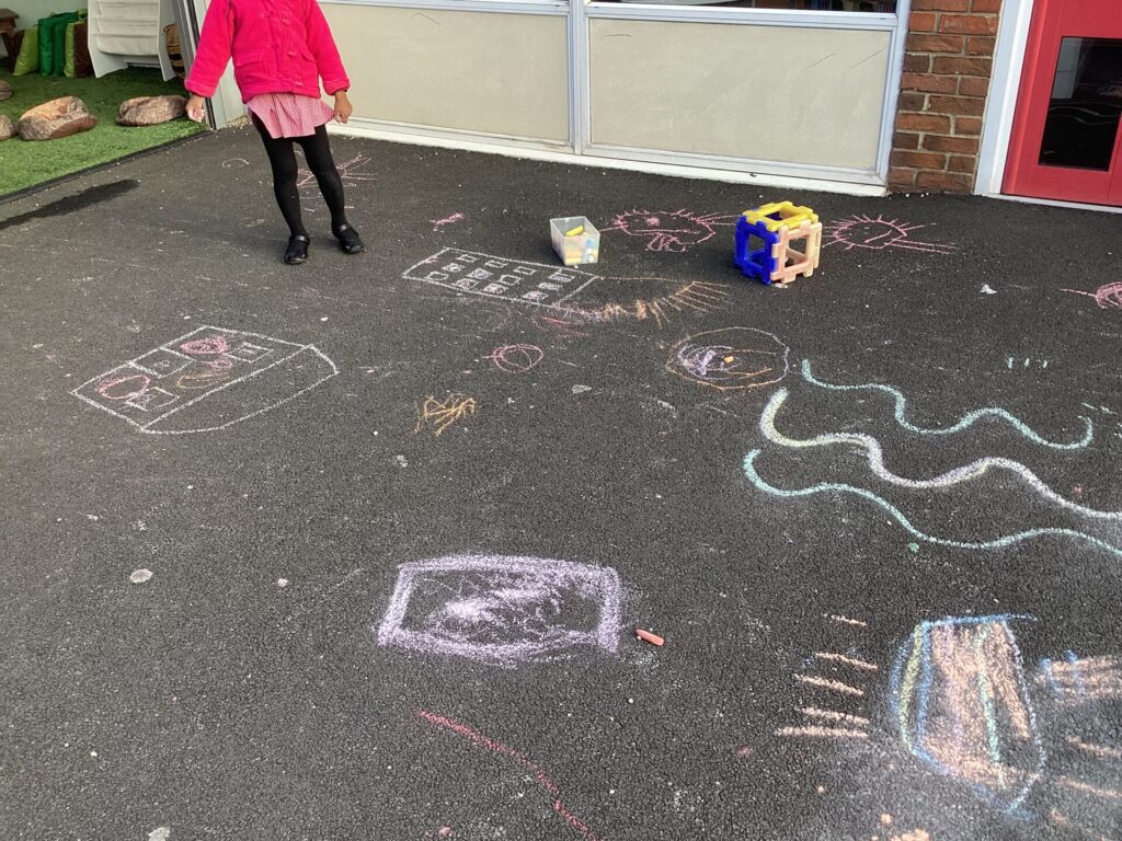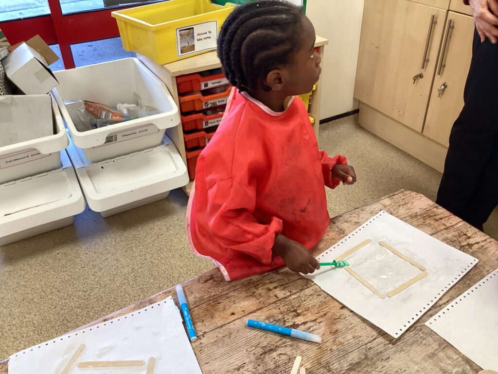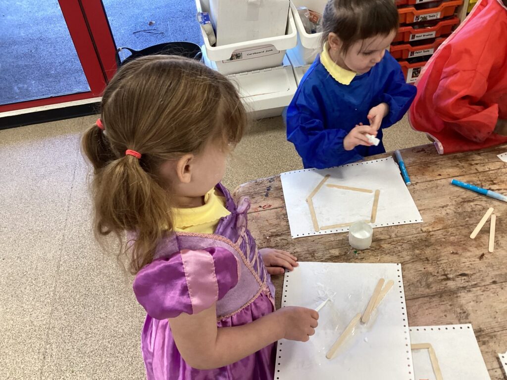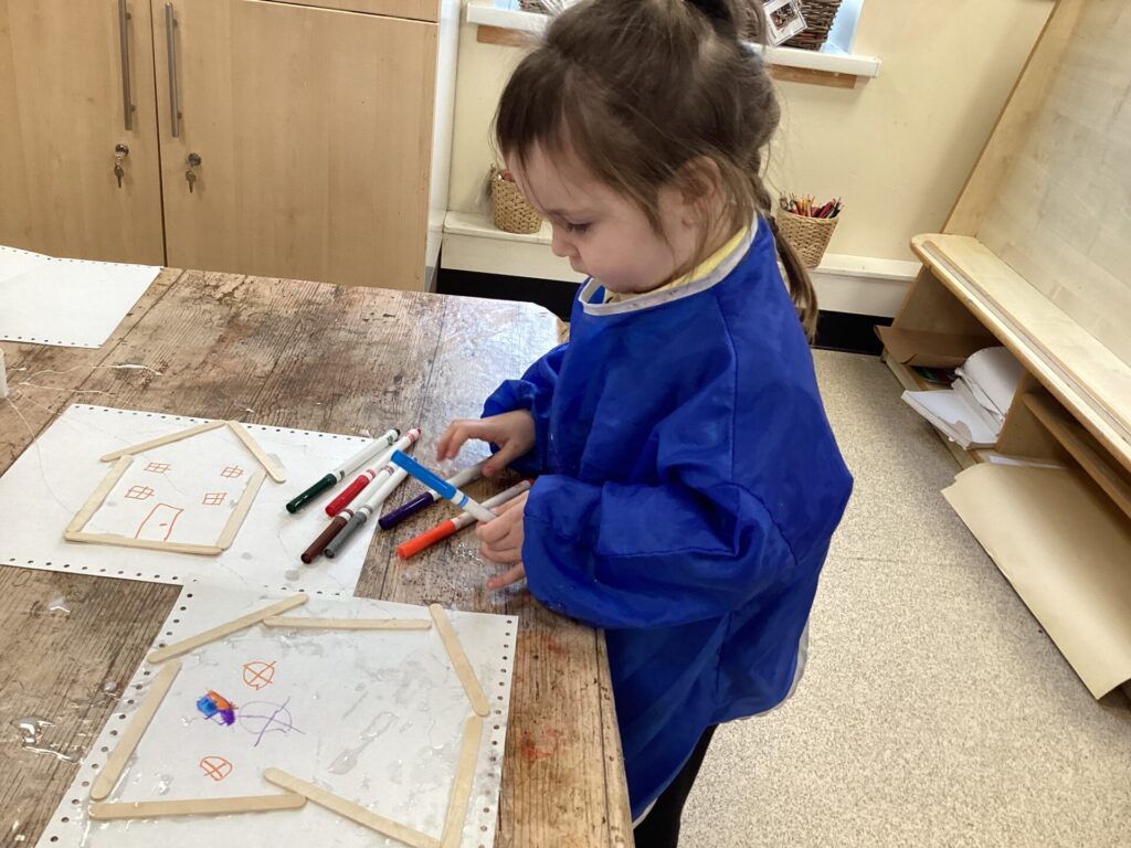 In the Art area, we made our own houses out of PVA glue and wooden sticks. We then drew on windows, a door and a roof. We had lots of time playing in our Home area, taking the babies to the park and making Peppa Pig ice cream! Outside, we used different coloured chalks to draw houses too.