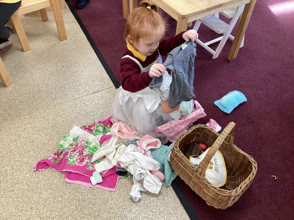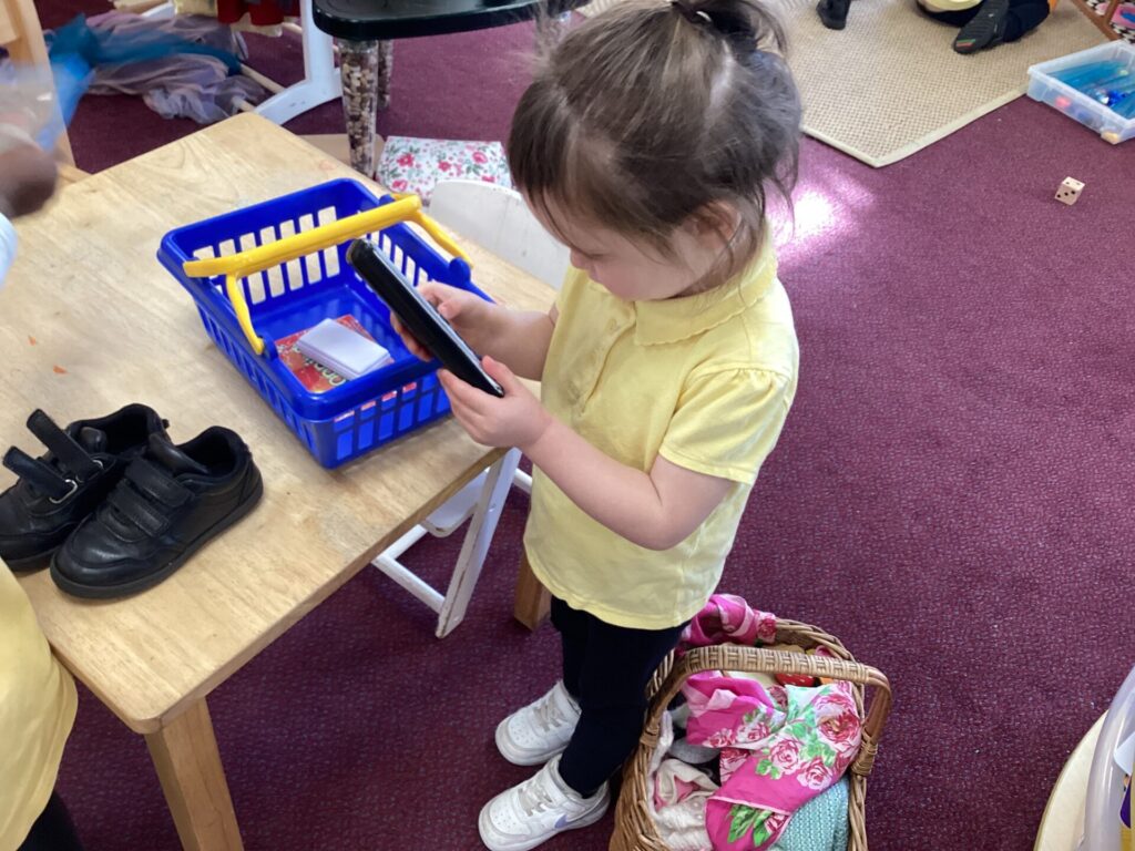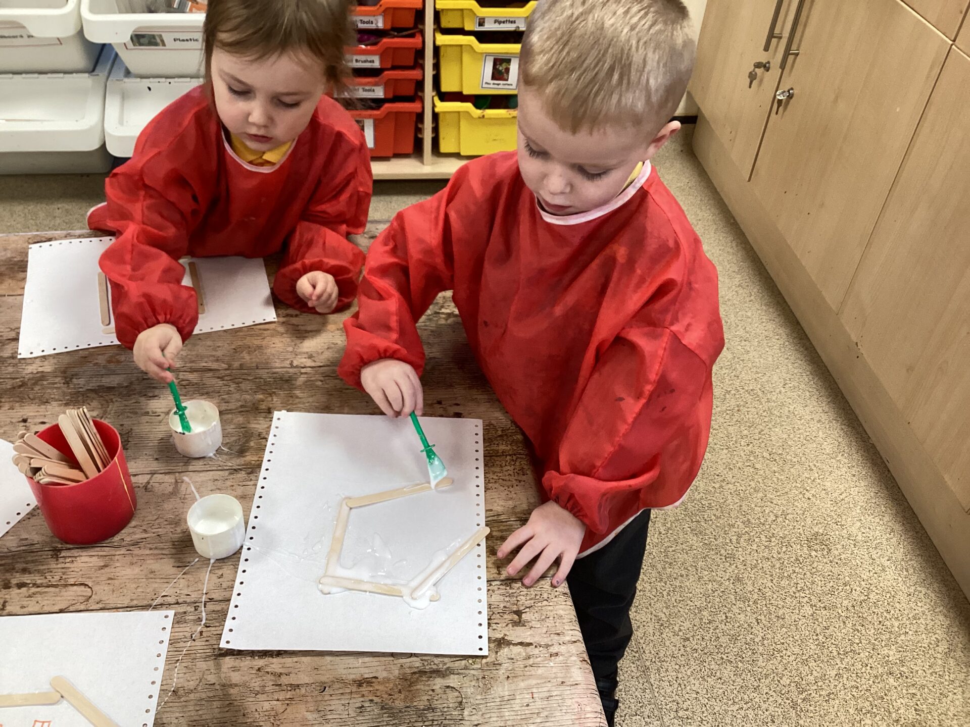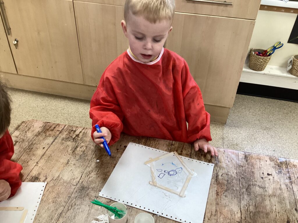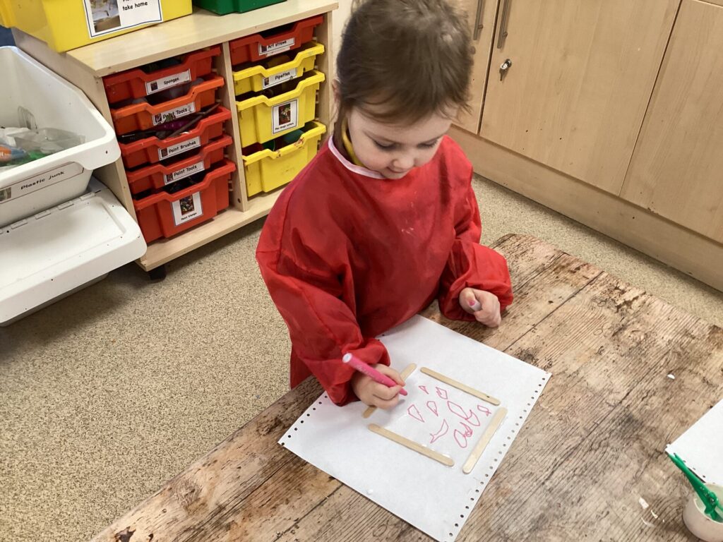 In the Art area, we made our own houses out of PVA glue and wooden sticks. We then drew on windows, a door and a roof. We had lots of time playing in our Home area, taking the babies to the park and making Peppa Pig ice cream! Outside, we used different coloured chalks to draw houses too.