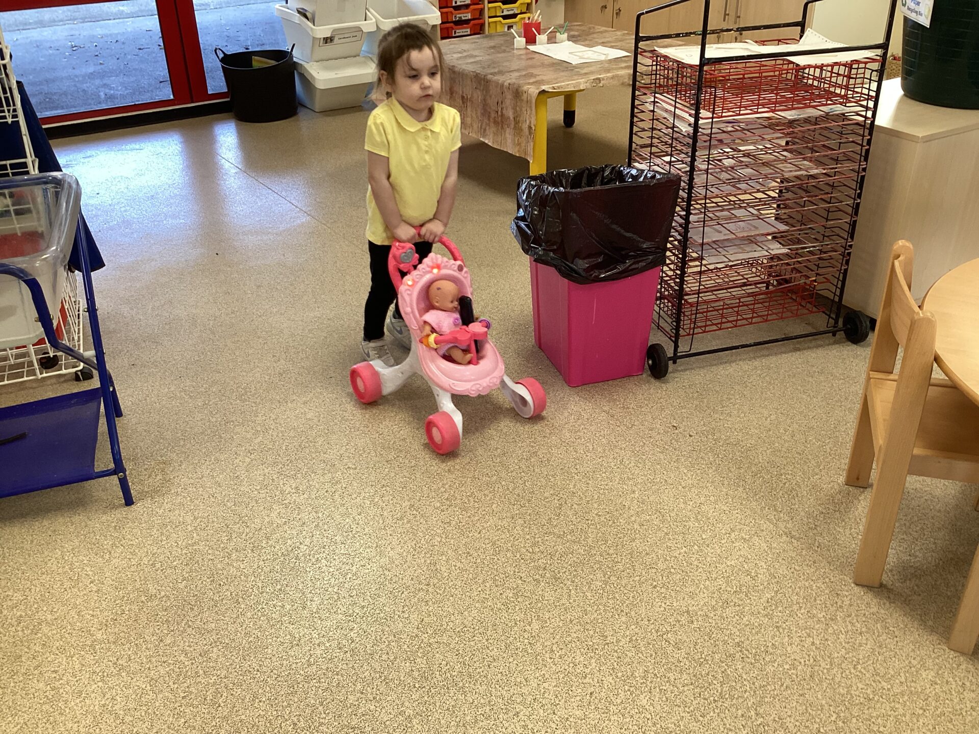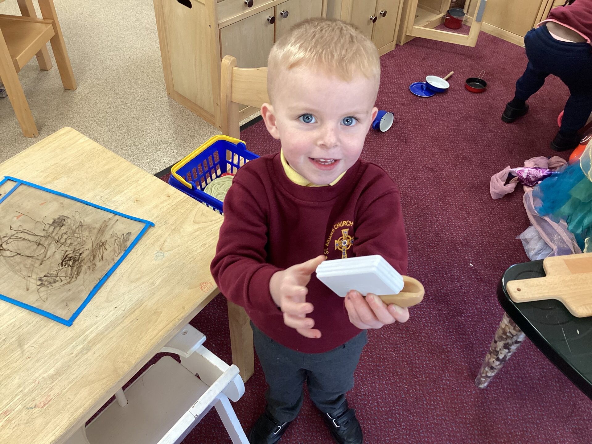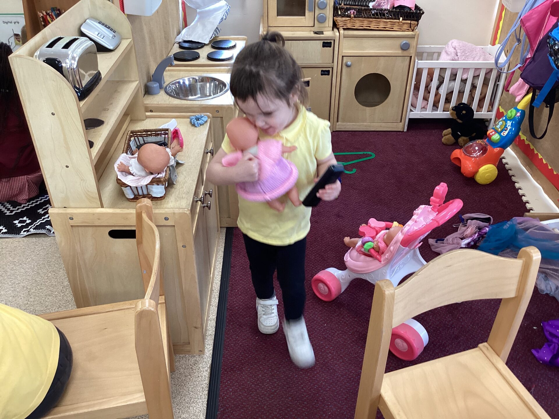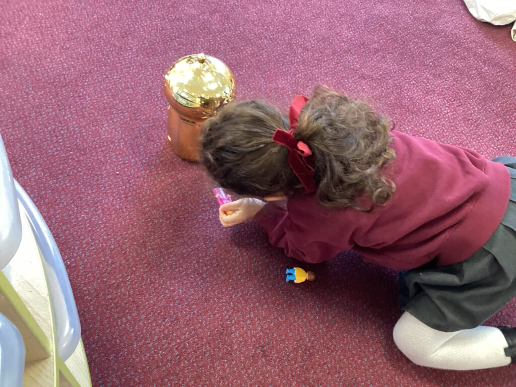 In the Art area, we made our own houses out of PVA glue and wooden sticks. We then drew on windows, a door and a roof. We had lots of time playing in our Home area, taking the babies to the park and making Peppa Pig ice cream! Outside, we used different coloured chalks to draw houses too.