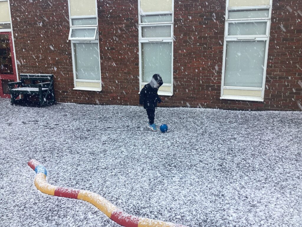 We were so excited by the snow, that we wanted to play outside. We popped on our cosy coats, hats and scarves and ran outside! We made marks in the snow by playing football, made snowballs and noticed that when we lifted up the hula hoops, that there were circle shapes from the hoops on the grass!