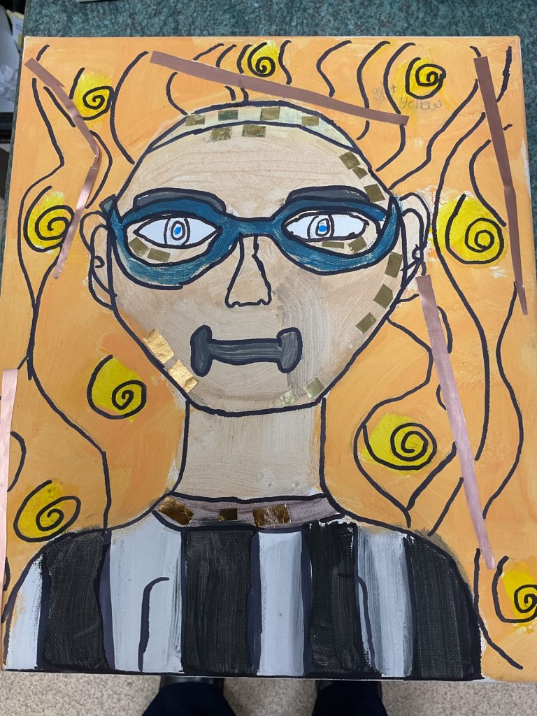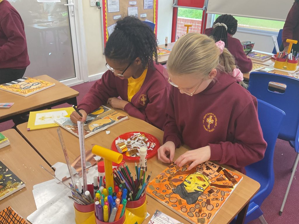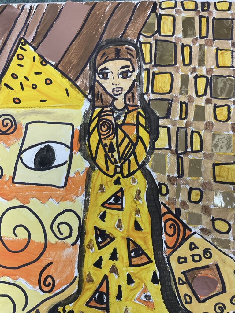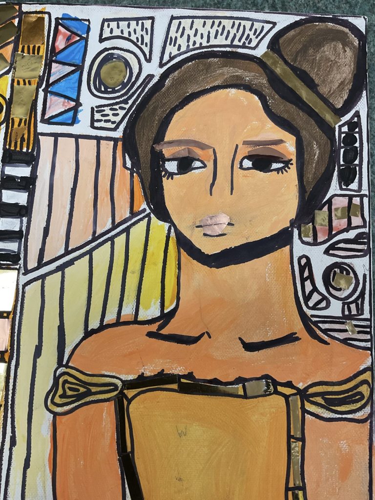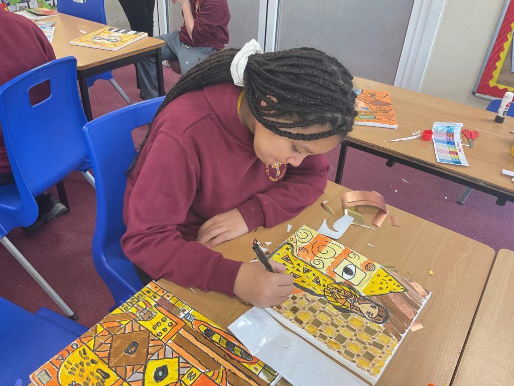 This half term, Year 6 have been learning about the Golden Period of Gustav Klimt. We began by looking at a range of his artwork. When we placed them in chronological order, we noticed that over time, Klimt’s artwork became less realistic and more mythical in style. He also began using a colour palette of different shades and tints of orange and yellow as well as adding gold leaf to his artwork. Inspired by Klimt’s ‘Golden Woman’, we created our own artwork of a mythical figure using different shades and tones of orange and yellow. We imitated the style of Gustav Klimt by adding metallic accents to our painting using metallic card.