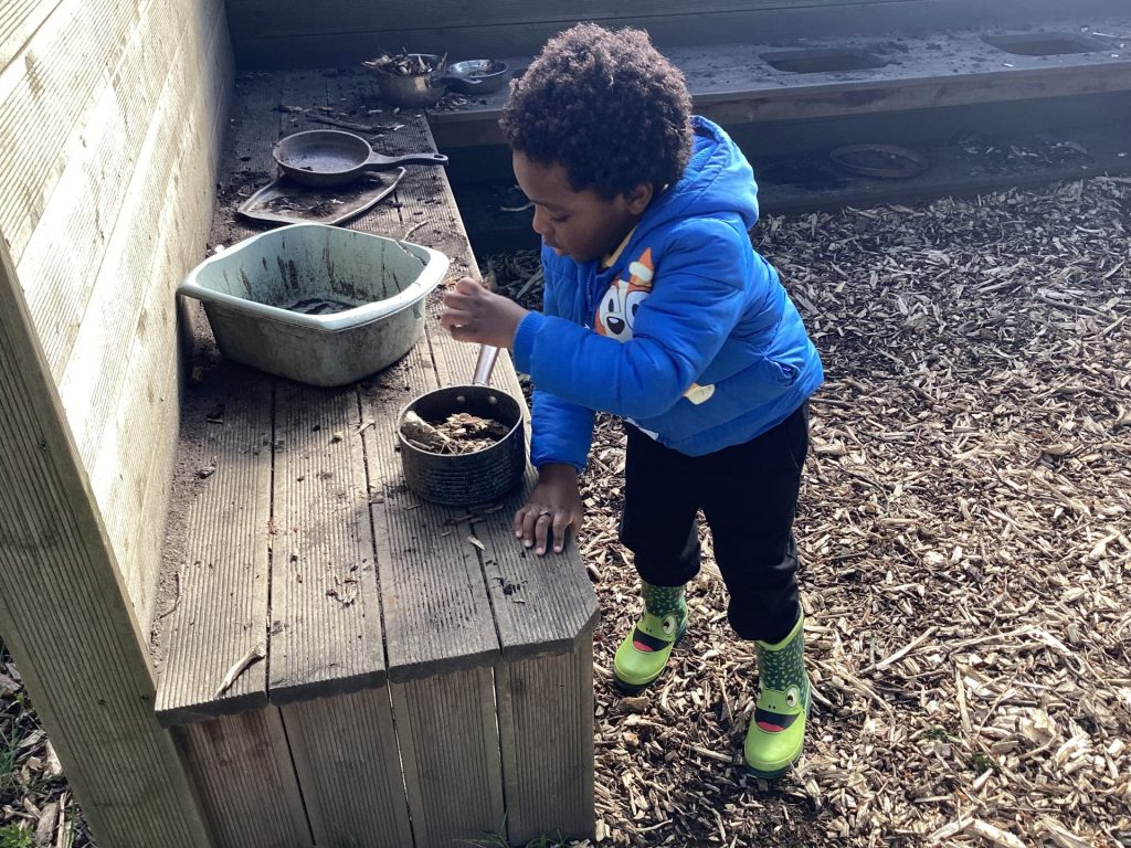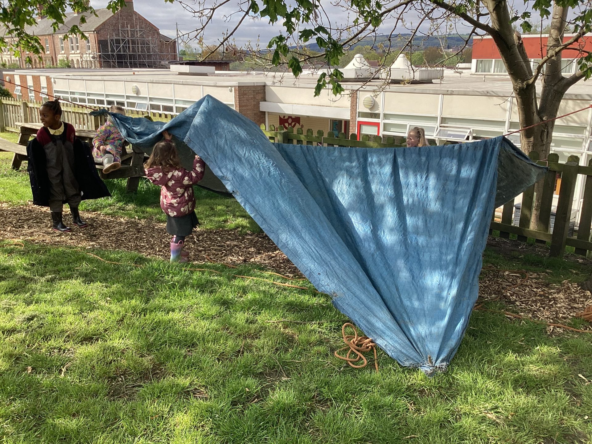 We built shelters with rope and tarpaulin. Our shelters were made into restaurants, so some of us made some delicious food in the mud kitchen, including: chocolate pies, soup and sandwiches.